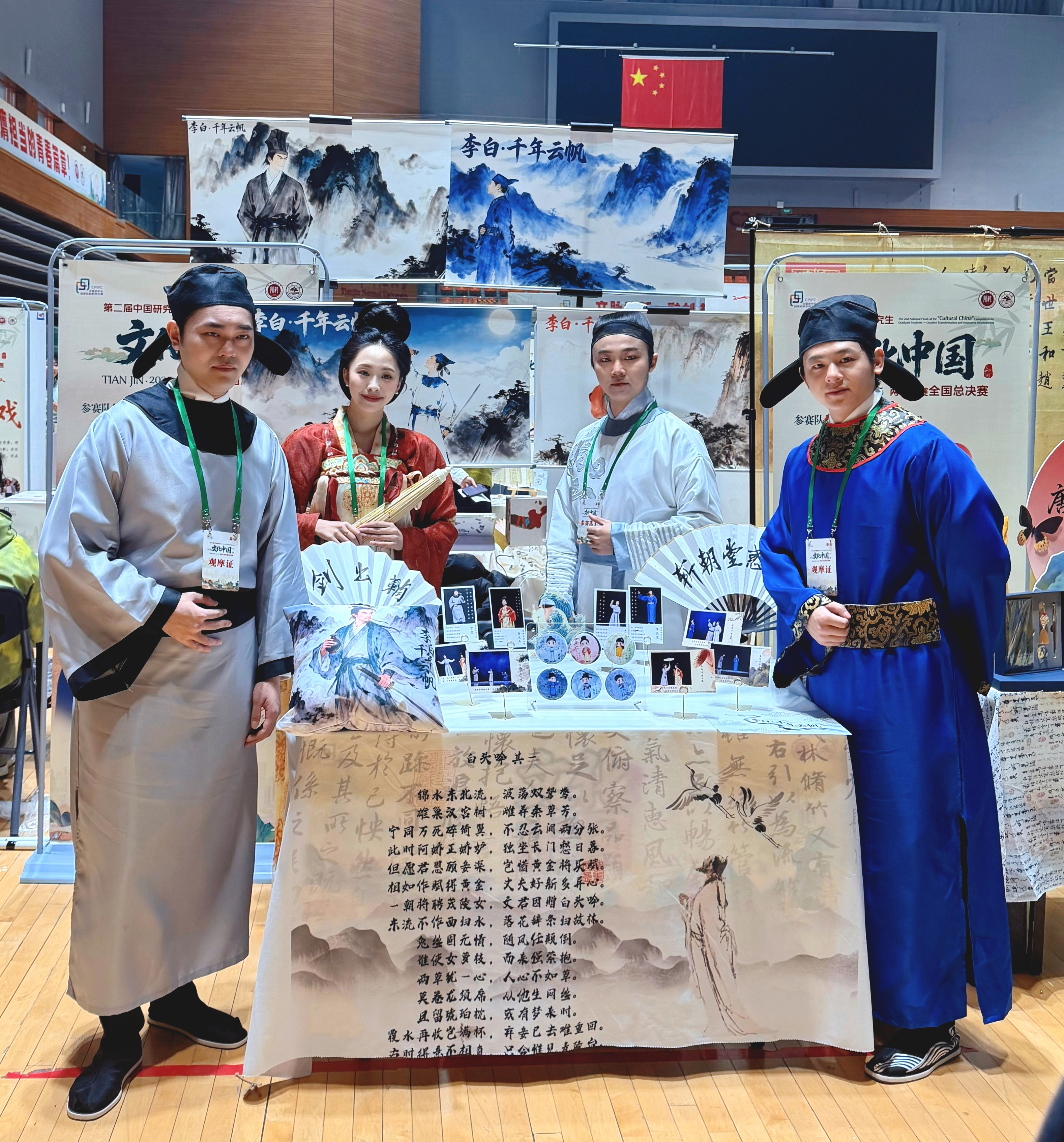 为让这份精神跨越时空传递,作品在艺术表达上大胆创新:12 分钟的篇幅暗藏 5 首精心创作的原创唱段,涵盖二重唱、三重唱、四重唱等丰富形式,流行摇滚的音乐风格打破传统历史题材的表达框架。舞台上的每一幕,都让李白 “长风破浪” 的云帆精神与当代大学生的现实困境深度映照,让文化血脉在青年群体中带着明确指引传承。 团队在比赛中还展示了一系列文创周边产品(包括吧唧、明信片、扇子、抱枕、挂画等),这些富有巧思的实物在现场展示环节,吸引了评委专家与观摩师生的浓厚兴趣,获得了积极反响。经过激烈角逐,原创音乐剧小品《李白・千年云帆》,以戏剧影视音乐组小组第一佳绩喜获全国总决赛一等奖。