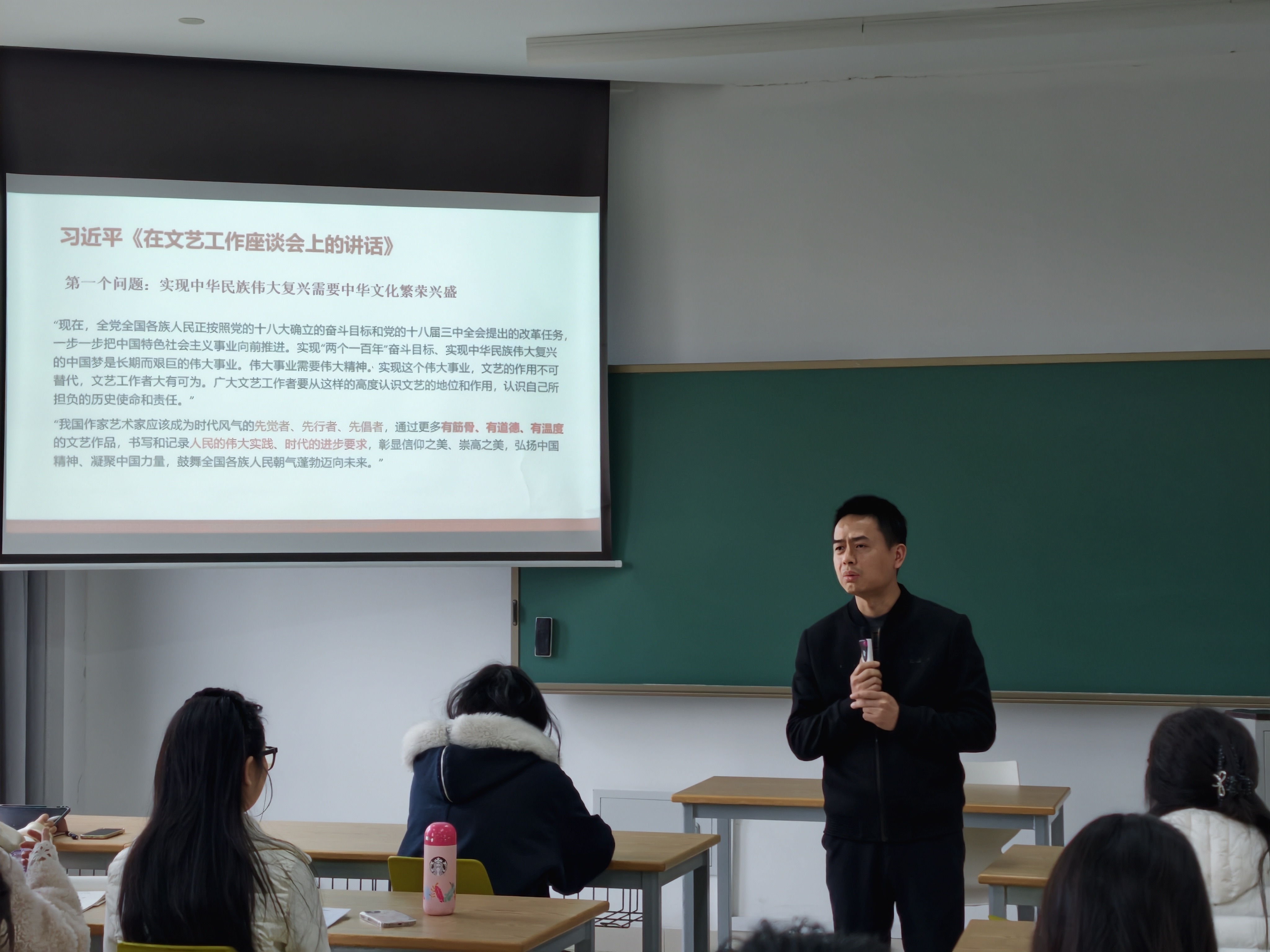 马院长带领研究生学习《在文艺工作座谈会上的讲话》核心要义,阐释文艺工作者的时代课题。他表示,音乐学习绝非单纯技术训练,更肩负着传承优秀传统文化、弘扬时代精神、增强文化自信的重任,要“创作无愧于时代的优秀作品”。马院长强调,文艺作品需扎根现实、贴近群众,才有温度与力量。他以彩虹合唱团《春节自救指南》为例,指出文艺创作要读懂大众情感,同时警惕低俗浮躁现象,以严肃态度创作有筋骨、有温度的精神食粮。
